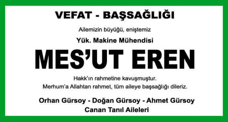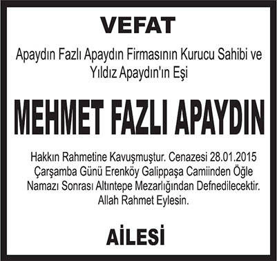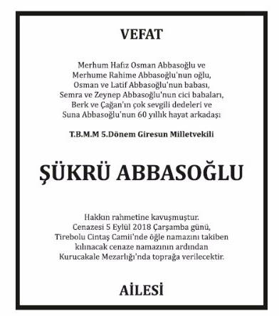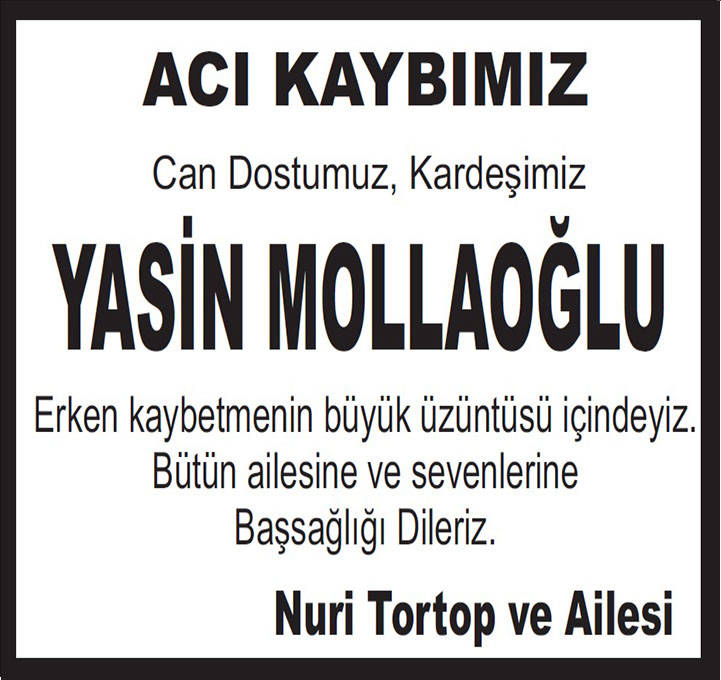 Ne kadar acıda olsa ölüm hayatın bir gerçeği sevdiklerimizi güzel günler geçirdiğimiz dünyamızdan ebedi yolculuklarına uğurlarken vefat mesajı duyurularımızı yapmak isteriz, Türkiye'nin en çok trajlı gazetesinde istediğiniz ölçülerde ister fotoğraflı ister tam yada yarı sayfa vefat ilanlarınızı verebilirsiniz. Detaylı bilgi için bizi arayın İSTANBUL : 0212 855 22 24 ANKARA : 0312 426 09 02